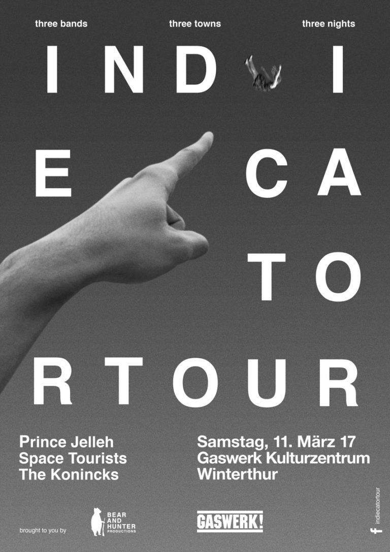 Die Indiecator Tour 2017 bringt The Konincks, Space Tourists und Prince Jelleh gemeinsam auf die Bühnen ihrer Heimatregionen. Start ist am 10.02. im Hirscheneck Basel, am 03.03. macht die Tour Halt im Luzerner Südpol. Das Tourfinale wird am 11.03. im Gaswerk Winterthur gefeiert. Ziel ist es, regionale Grenzen zu überwinden und die Bands von etwas weiter weg mit dem jeweiligen Heimpublikum bekannt zu machen. Drei Bands, drei Städte, drei Nächte.