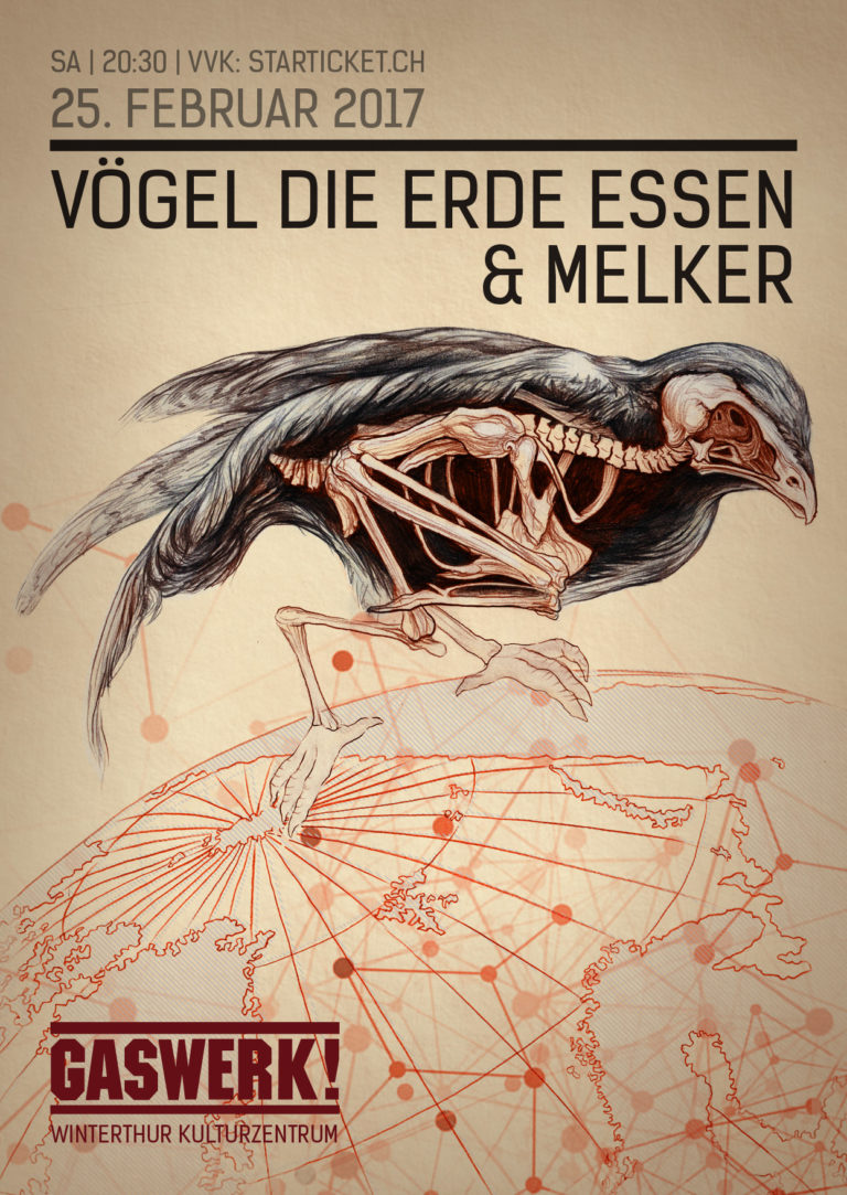 Nach einem Konzert von Vögel die Erde essen kam mal jemand aus dem Publikum zur Band und erzählte, er hätte gerade das Gefühl gehabt, einen brennenden Zug an sich vorbeifahren zu sehen. Die Musik der drei Berliner Musiker ist in der Tat dramatisch. Die Band hat Punk, Noise Rock, R ́n ́b, Krautrock und Black Metal zu einem Sound zusammengeschmolzen, der auf Konzerten und im Studio von der explosiven wie minimalistischen Besetzung Bass, Gitarre, Schlagzeug und drei Stimmen getragen wird. Ihre Musik erinnert an einen Science-Fiction-Film aus den 50ern, die kantigen Punkparts könnten die Neuvertonung eines Ed-Wood-Films sein, während die ausufernden Krautrockpassagen eher eine Film-Noir-Ästhetik haben. Nicht dumpf, sondern als wilde Party kommt das Jüngste Gericht daher. Denn wenn die Vögel die Erde essen ganze Welten in sich zusammenkrachen lassen, entsteht aus den Trümmerteilen umgehend etwas Neues, fremdartig Schönes. Bei Kreismusik erschienen ist ihre selbstbetitelte EP und das Album „Besuch von Innen“ (2015).