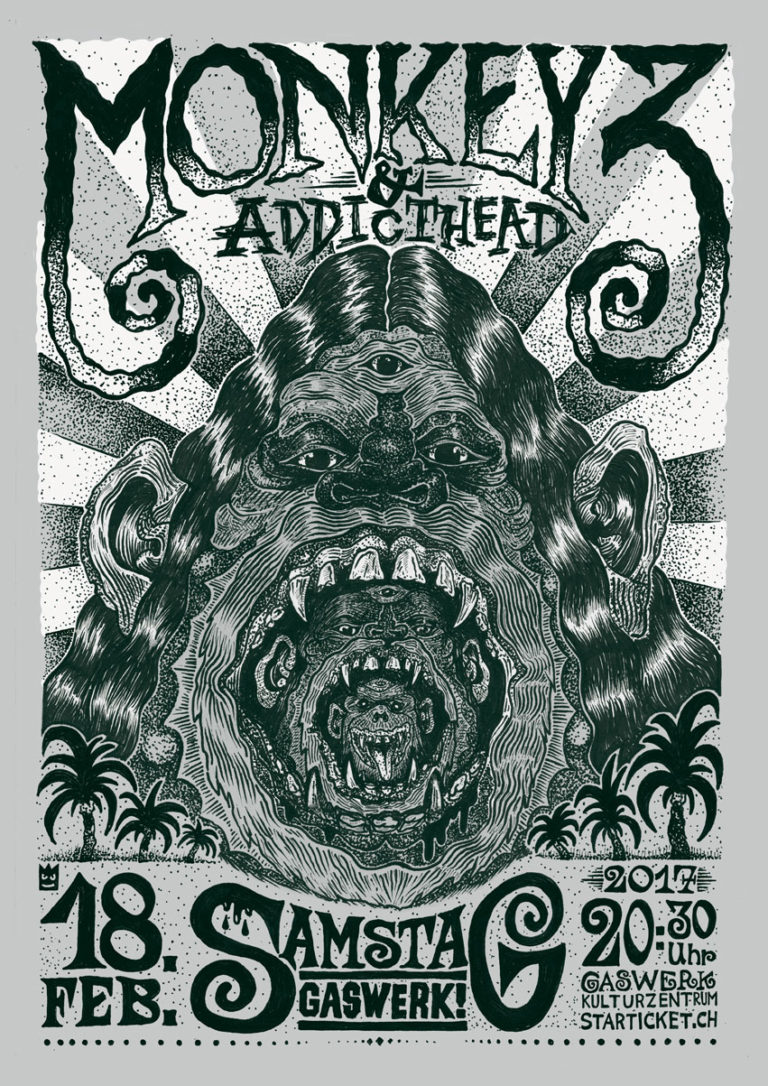 Willkommen zur «cosmic wall of sound»: Psychedelische Klänge gemischt mit Stoner-Rock und Progressive ergibt die instrumentale Musik zum Abheben von Monkey3. Zuerst nur zu Jamsessions zusammenkommend, suchten die Lausanner Jungs ab 2001 lange nach einem geeigneten Sänger. Die Suche wurde aber nach der ersten instrumental eingespielten Demo ein für alle Mal eingestellt: Die entstandene Musik machte jeden Gesang überflüssig. Mit diesem überzeugenden Schaffen gewannen sie Konzert für Konzert neue Fans und begaben sich auf zahlreiche Tourneen quer durch Europa. Nun machen Monkey3 zum wiederholten Male einen Abstecher ins Gaswerk. Heb zusammen mit ihnen ab und reise in den Kosmos von Space-Rock, Progressive und Stoner!