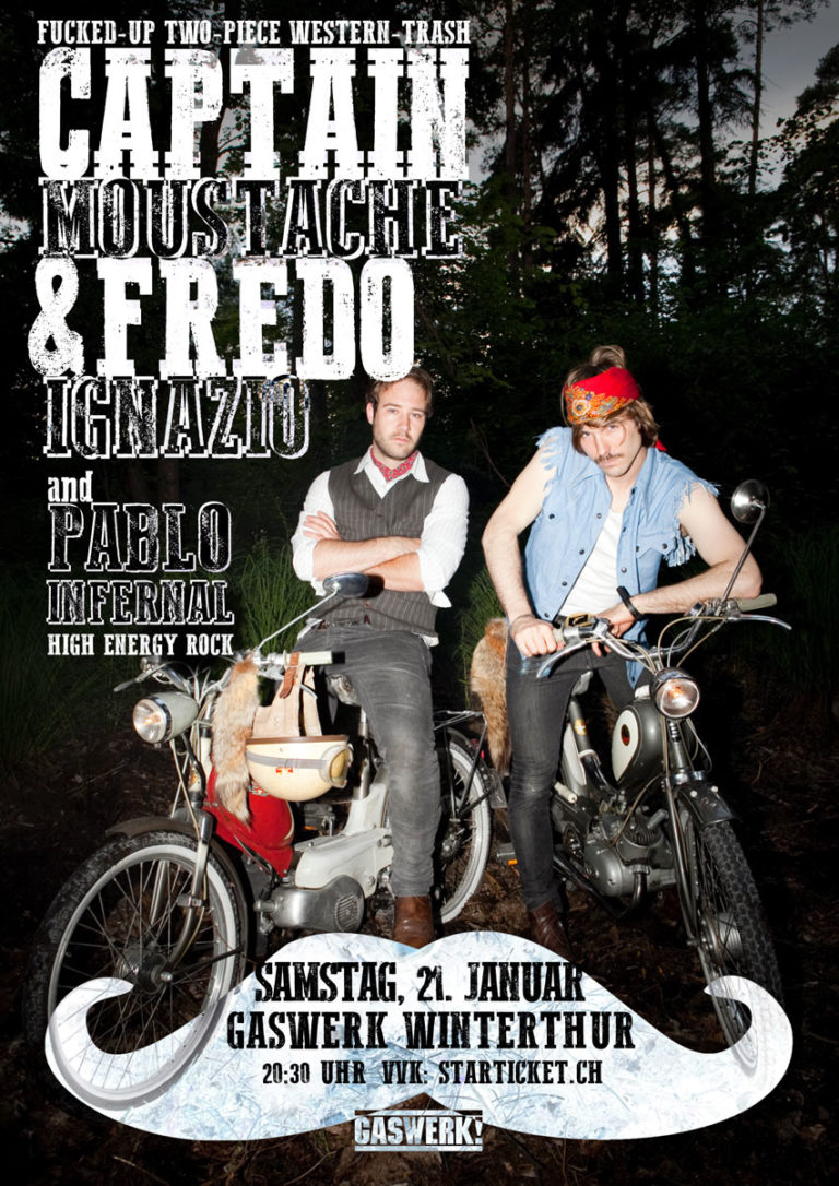 Ein Schuss Country, eine Prise Trash und eine handvoll Minimalismus. So präsentiert sich das Glarner Duo Captain Moustache & Fredo Ignazio. Aufgewachsen in einem kleinen Dorf inmitten der Schweizer Berglandschaft entdeckten sie früh ihre Leidenschaft für die Westernmusik. Gemixt mit ihrer Liebe zum old-style und ihrem Punk-Hintergrund ergibt das etwas, was die Jungs als «fucked-up self-destructing two-piece-western-trash» bezeichnen.