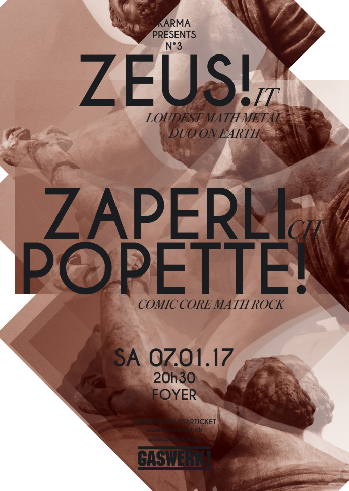 Wir empfehlen hierfür eine mathematische Extremübung und präsentieren euch dazu ZEUS!, auch bekannt als das «Loudest Math Metal Duo on Earth». Dies ist ein grosses Versprechen, doch wir garantieren, dass ZEUS! Sogar noch viel mehr bieten. Genremässig lassen sie auch Stile wie Hardcore, Punk und Grind in ihre Musik einfliessen. Vor allem aber sind sie nicht nur laut (darüber müssten sie letztlich sowieso auch mit unserem Tontechniker verhandeln), sondern auch extrem energiegeladen, schrill, erfrischend frech und unkonventionell. Ihre Stücke sind dennoch nicht bloss konstant furios und wild, sondern bieten berraschenderweise – und das macht das Duo noch interessanter – auch ruhige, ambientös-noisige Passagen. Trotz Dreisatz und Pythagoras: ZEUS! präsentieren sich durchgehend unkonventionell überraschend. Entsprechend entlocken sie dem interessierten Zuhörer auch weniger ein «Heureka!» als ein verblüfftes «Zapperlot!».