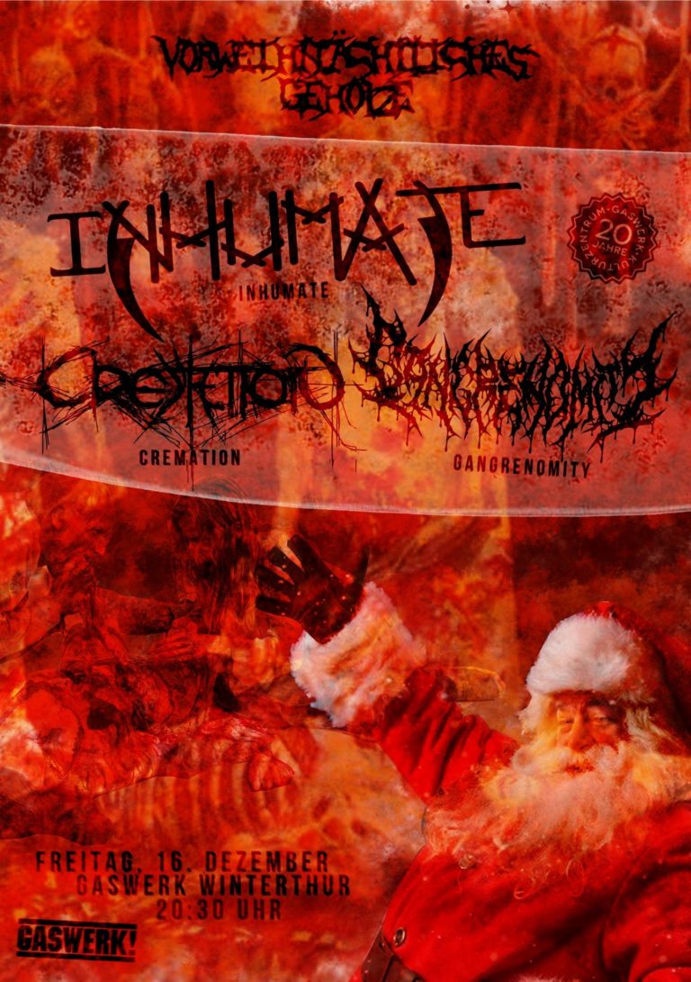Doch was wäre ein vorweihnächtliches Geholze ohne Gangrenomity? Zu viert rütteln die Tessiner die Undergroundszene des Brutal Death Metal seit wenigen Jahren auf. Schnelle Riffs, technische Raffinesse, brutaler Gesang – dies beherrschen Gangrenomity bis hin zur Perfektion. Obschon erst seit 2013 aktiv, haben sich die Jungs einen festen Platz im Brutal Death Metal erarbeitet. Ganz nach dem Motto: Brutal? Brutaler? Gangrenomity!