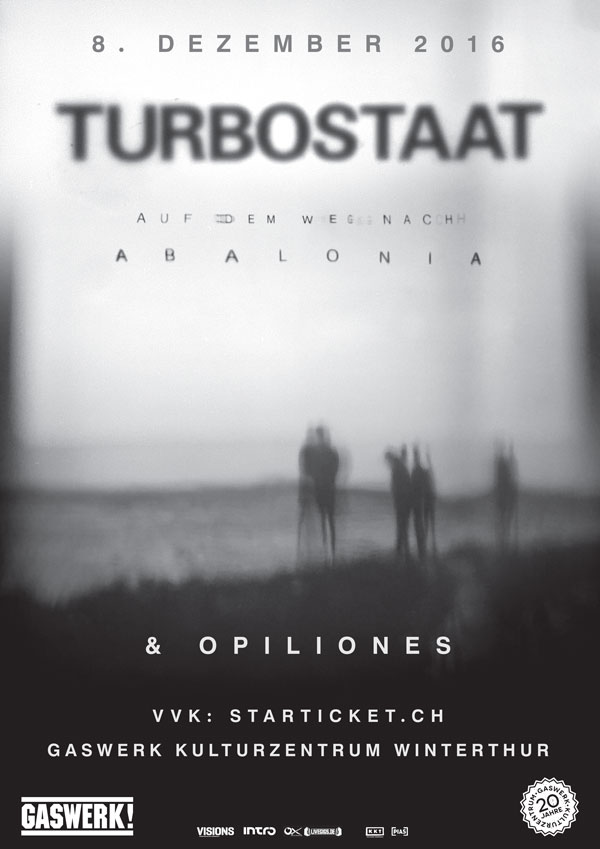 Nach 2 Jahren meldet sich die norddeutsche Band Turbostaat mit ihrem 6. Album «Auf dem Weg nach Abalonia» zurück. Mit ihrem ersten Konzeptalbum liefern die fünf Jungs düster lackierten Punkrock, der einmal mehr das klassische Punk Genre sprengt. Sphärische, teilweise elektrische Klänge mischen sich spannend und ereignisreich zu einer gelungen Erzählung von der fiktiven Reise Frau Semonas nach dem imaginären Schicksalsort Abalonia. Die fiktive Geschichte ist ein Kommentar auf die derzeitigen politischen Verhältnisse, eine Antwort auf zunehmenden Fremdenhass und gesellschaftliche Fehlentwicklungen. Die Tour ihres Abalonia-Albums im Frühjahr brachte ihnen fünf ausverkaufte Shows. Jetzt machen sie endlich Halt in Winterthur und erzählen uns live von der Utopie Abalonia.