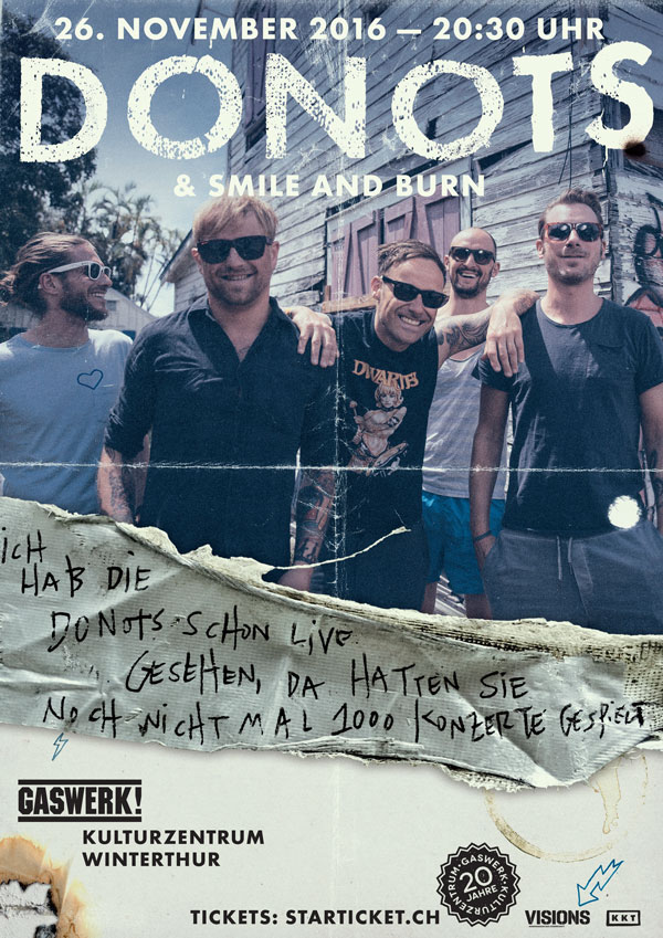 Nach 22 Jahren, 10 Alben und fast 1000 Konzerten fehlte den Donots eigentlich nur noch etwas in ihrem Palmarès: Ein Konzert im Gaswerk Kulturzentrum in Winterthur. Die Alternative- und Punkrock-Überväter aus dem grossen Kanton machen dies nun endlich wahr auf ihrer «Ich habe die Donots schon live gesehen, da hatten sie noch nicht mal 1000 Konzerte gespielt»-Tour. Wer diese Worte eines Tages seinen Enkelkindern erzählen können will, weiss was zu tun ist. Wer einfach nur Bock auf tausendfach qualitätsgeprüften Gute-Laune-Punk und Pogo hat, ebenso. Denn sicher ist: Die Donots geben Show für Show alles und reissen mit.