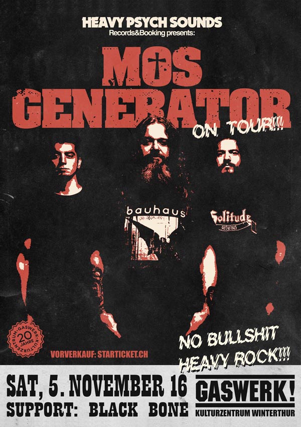 Virtuosen Heavy Rock mit einem Hauch Stoner gefällig? Dann präsentieren wir Mos Generator! Tony Reed und seine beiden Kollegen rocken seit nunmehr 16 Jahren die Bühne und veröffentlichten in dieser Zeit zwei Alben sowie mehrere Singles. Das US-amerikanische Trio schafft es gängige Riffs, virtuose Soli mit tiefgründigen Texten von Aktualität zu vereinen. Dieser Mix, welcher Mos Generator abliefern, verleiht dem gespielten Heavy Rock ein einzigartiges Flair. Wir dürfen also gespannt sein, wenn sie auf ihrer Europatournee im Gaswerk Halt machen.