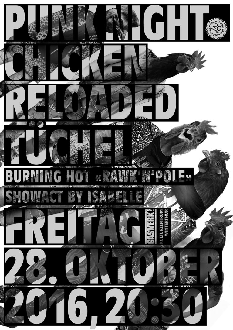Chicken Reloaded: Vier Bieler Punk’n’Roll Hühner fanden sich 1998 als Theo’s Fried Chickenstore zusammen. Als Wohnzimmerpartyband rockten sie mit einem Mix aus Punkrock, Rockabilly und Swing in Garagisten-Overalls nicht nur Wohnzimmer, sondern auch die Bühnen der Schweiz und des benachbarten Auslands. Ganze 16 Jahre lang ging es rund, dann taten es die Hühner dem Phönix gleich und zerfielen zu Asche. Natürlich nur um im neuen Glanze aufzuerstehen. Entstanden ist Chicken Reloaded, 4 sexy Hühner-Boys aus Biel mit 110% tanzbarem Punk’n’Roll im Gepäck. Eine kraftvolle Hommage an die Punklegenden The Clash und Dead Boys, die nicht ohne wilde Tanzeskapaden, Schweissausbrüche und Bierduschen über die Bühne geht.