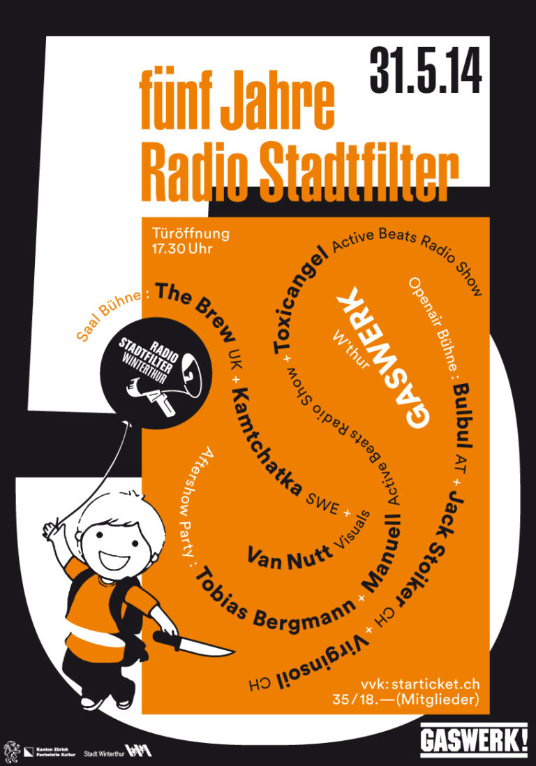 Der Lokal- und Kultursender Radio Stadtfilter feiert seinen fünften Geburtstag mit einem Fest am 31. Mai 2014 im Gaswerk. Fünf Bands spielen am Samstag Openair- und Clubkonzerte, um diese Erfolgsgeschichte aus dem Äther zu würdigen.