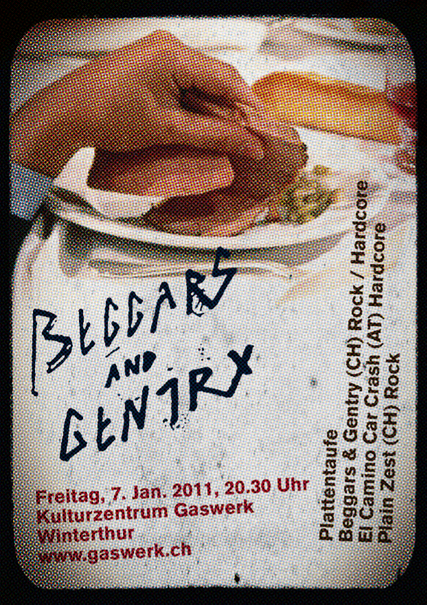 Beggars and Gentry taufen ihr erstes Album! Die Band ist zwar noch jung, die Mitglieder aber alle keine blutigen Anfänger mehr – enstammen sie doch Bands wie Solid Ground, Dryconditions, Within Walls oder Fall Apart. Und das spürt man ihrer Musik auch an: Beggars and Gentry spielen einen soliden, groovigen Mix aus Hardcorepunk und Rock'n'Roll. Unterstützt werden sie von den Schaffhauser Spassrockern Plain Zest und den Vorarlbergern El Camino Car Crash.