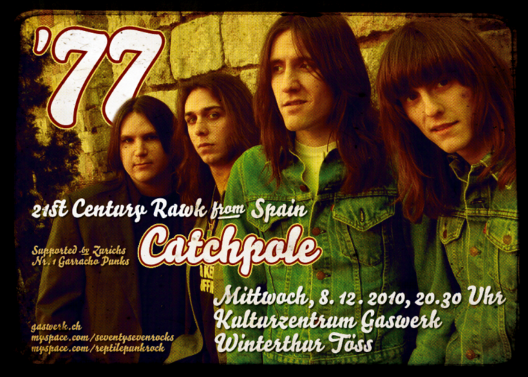 Seit Jahren immer wieder auf der Bühne des Gaswerks und stets gern gesehene Gäste. Catchpole aus Zürich erfüllen die Assoziation mit der Zahl 77 eher als der spanische Hauptact danach. Schneller, rythmisch versierter Punk, der dank der Stimme von Sänger Nik und den Ein-Flüssen von massig Bier und Schnaps eine Härte erzeugt, die von der Band als Reptile-Punk bezeichnet wird.