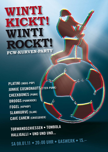 Die Fans des FC Winterthur feiern wieder mal eine ihrer mittlerweile schon legendären Feste. Nach dem Motto „Winti kickt, Winti rockt“ wird nochmals die gleichnamige CD, in Kreisen der Fussballfans, gefeiert. Was einst als Benefiz-Anlass für den FCW begann, als dieser in Finanznöten steckte, ist mittlerweile zu einem legendären kulturellen Anlass mutiert. Viele Künstler, die dem Winterthurer Fussballverein nahe stehen, haben im Laufe der Jahre schon ihr Gastspiel gegeben. Auch die 1. Mannschaft kommt regelmässig zu Besuch und hat auch schon gegen die Fans im Torwandschiessen verloren.