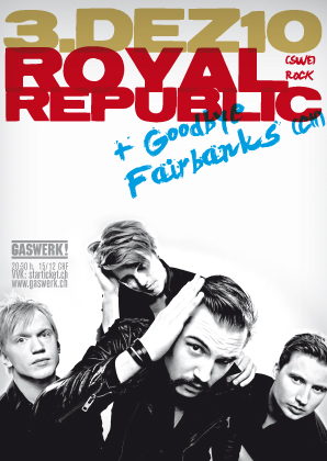 Schon bald werden Royal Republic die ganz grossen Bühnen dieser Welt rocken. Und ihr könnt dann damit angeben, die Schweden halt schon im Gaswerk gesehen zu haben. Aber nur wenn ihr Royal Republic am 3. Dezember nicht verpasst. Königliches Ehrenwort!