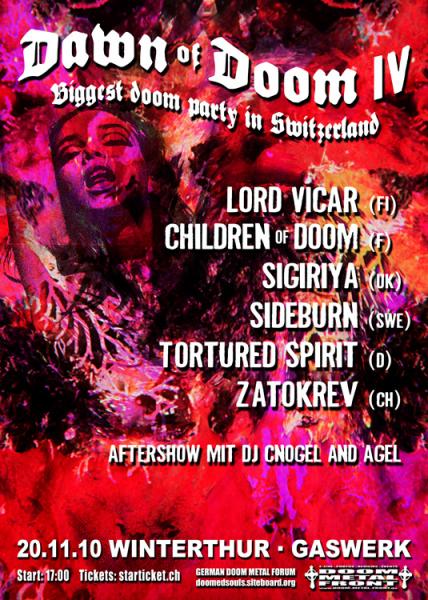 Das Dawn of Doom (DoD) geht nun mittlerweile in die vierte Runde und es wird wieder im Gaswerk stattfinden! Den Anfang des abends werden Children of Doom aus Frankreich machen, ihre Musik prägt die alte schule des Doom, hier trifft Saint Vitus auf Motorhead. Das ganze nennt sich dann Doom`n`Raw Metal. Als nächstes spielen Tortured Spirit aus Deutschland mit ihren traditionellen Doom Metal. Danach wird es lauter, denn Zatokrev aus Basel betreten die Bühne mit ihren brachialen Doom Metal. Nach Zatokrev wird’s wieder etwas ruhiger, Sigiriya aus Wales sind die nächste, Sigiriya sind ex Mitglieder der legendären Band Acrimony. Ihre Musik kann man Psychedelic Stoner Doom nennen. Die Stonerrock Doomer Sideburn aus Schweden sind Rock`n`Roller unter den Doomer, sie werden das Gaswerk zum Kochen bringen. Und zu guter letzt spielen alte bekannte wieder mal auf dem Dawn of Doom. Die Oldstar Doom Metal band Lord Vicar haben schon vor zwei Jahren auf dem DoD gespielt. Es spielen Mitglieder von Saint Vitus, Reverend Bizarre, Count Raven, Centurious Ghost. Mehr muss man über diese Band nicht schreiben, einfach Kult! Wer dann immer noch nicht genug hat, kann sich dann auf der Aftershow richtig den Rest geben!