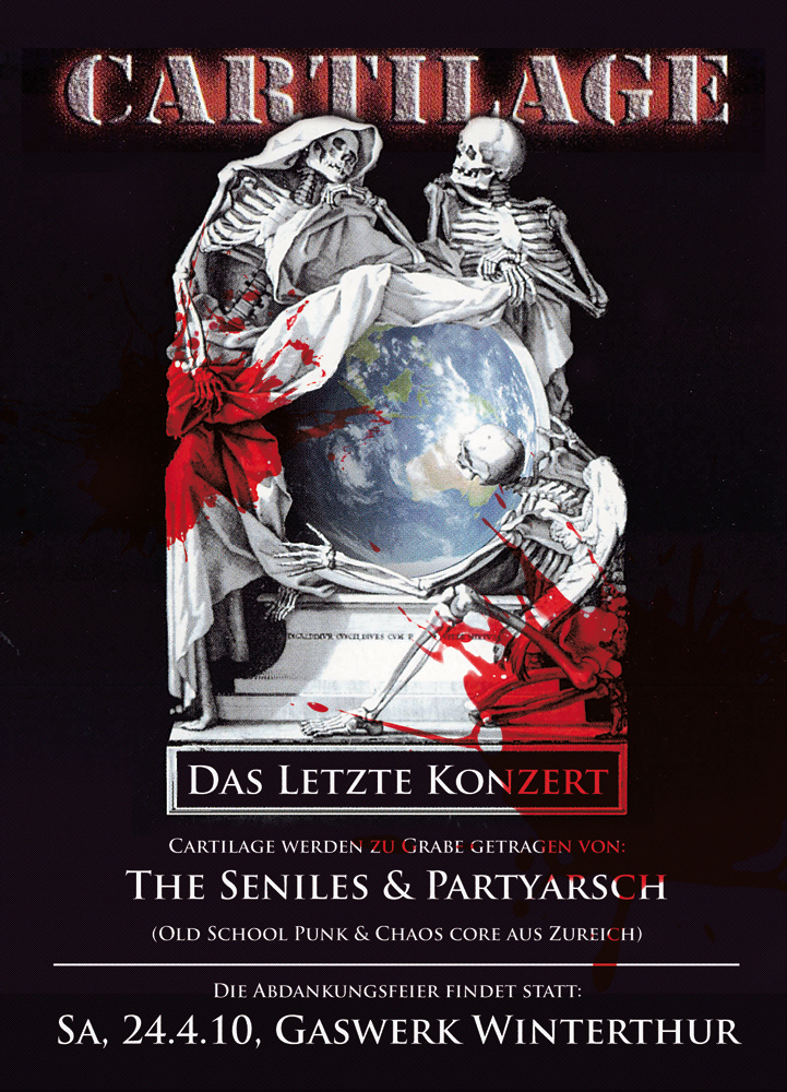 Cartilage gehören zu den alten Hasen der Winterthurer Punkerei. Schnell und dreckig mit deutschen Texten, so wie richtiger Hardcore-Punk tönen soll! Fussball, Punk und Chaos heisst das Motto. Nach rund sieben Jahren Bandgeschichte geben die vier Jungs nun im Gaswerk zum letzten Mal Vollgas. Das wird eine Fete!
