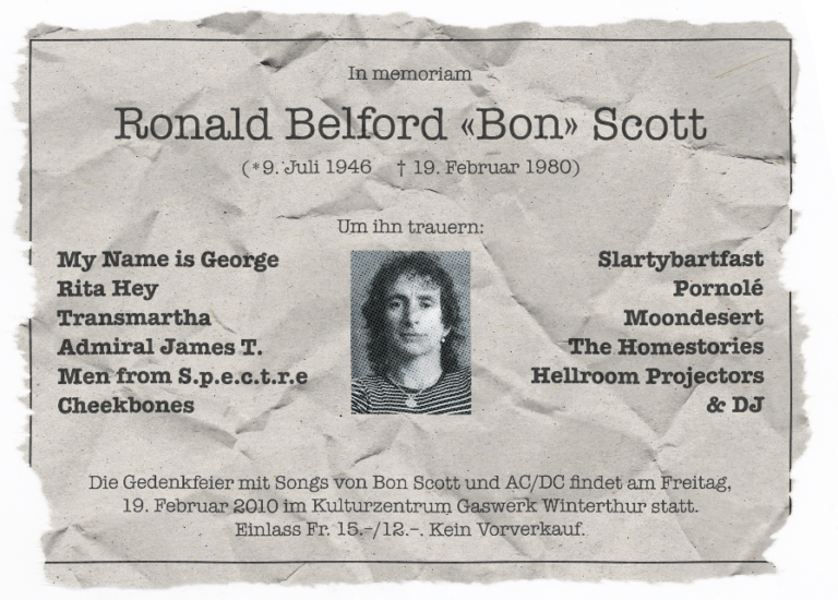 Aus Anlass des 30. Todestags von Bon Scott geht im Winterthurer Gaswerk eine spezielle Feier über die Bühne. Der Aufruf an mehrere Grössen der einheimischen Rockszene, mindestens drei Songs von Bon Scott oder AC/DC zu spielen, fand regen Anklang. So treten am 19. Februar 2010 nicht weniger als elf Winterthurer Acts auf.