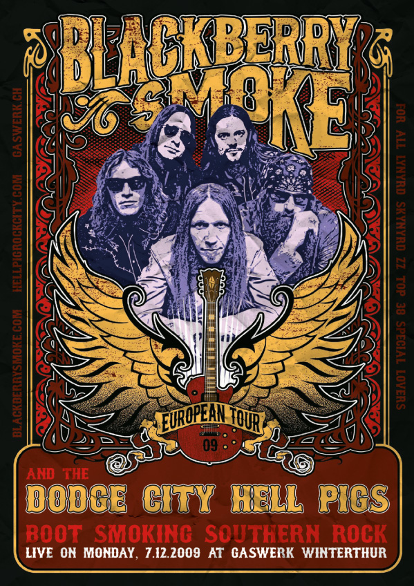 Blackberry Smoke aus Atlanta rocken seit über neun Jahren die amerikanische Musikszene. In den letzten zwölf Monaten haben die fünf Jungs die Bühne mit Grössen wie ZZ Top, Lynyrd Skynyrd, Shooter Jennings, Cross Canadian Ragweed und unzähligen anderen geteilt. Blackberry Smoke vereinen den Charme von Charlie Daniels, Waylon Jennings, Steve Earle und all den anderen mit der Würze der Georgia Satellites, Black Crowes und den Four Horsemen. Fans von Southern Rock à la Georgia Satellites und Lynyrd Skynyrd aufgepasst, hier kommt eure neue Lieblingsband! Auf ihrer ersten Europatour machen sie auch einen kleinen Abstecher in die Schweiz zu uns ins Gaswerk.