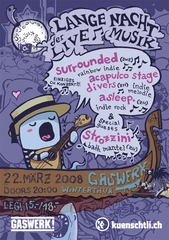 Strozzini (ZH): Sie sind seit einem Jahr praktisch ununterbrochen auf den Bühnen der Schweiz zu sehen, schreiben nebenbei neue Songs und packen jedes Mal treue Fans ein. Ihre Songs vermögen es, den bitteren Geschmack der Realität mit Schalk zu überschütten. Niemand soll beim Zuhören leiden müssen, lieber die Welt mit einem Schmunzeln betrachten, während man einen Schluck Wein trinkt oder mit offenem Mund da steht und sich von Tobias Röthlin's Stimme hinwegtragen lässt.